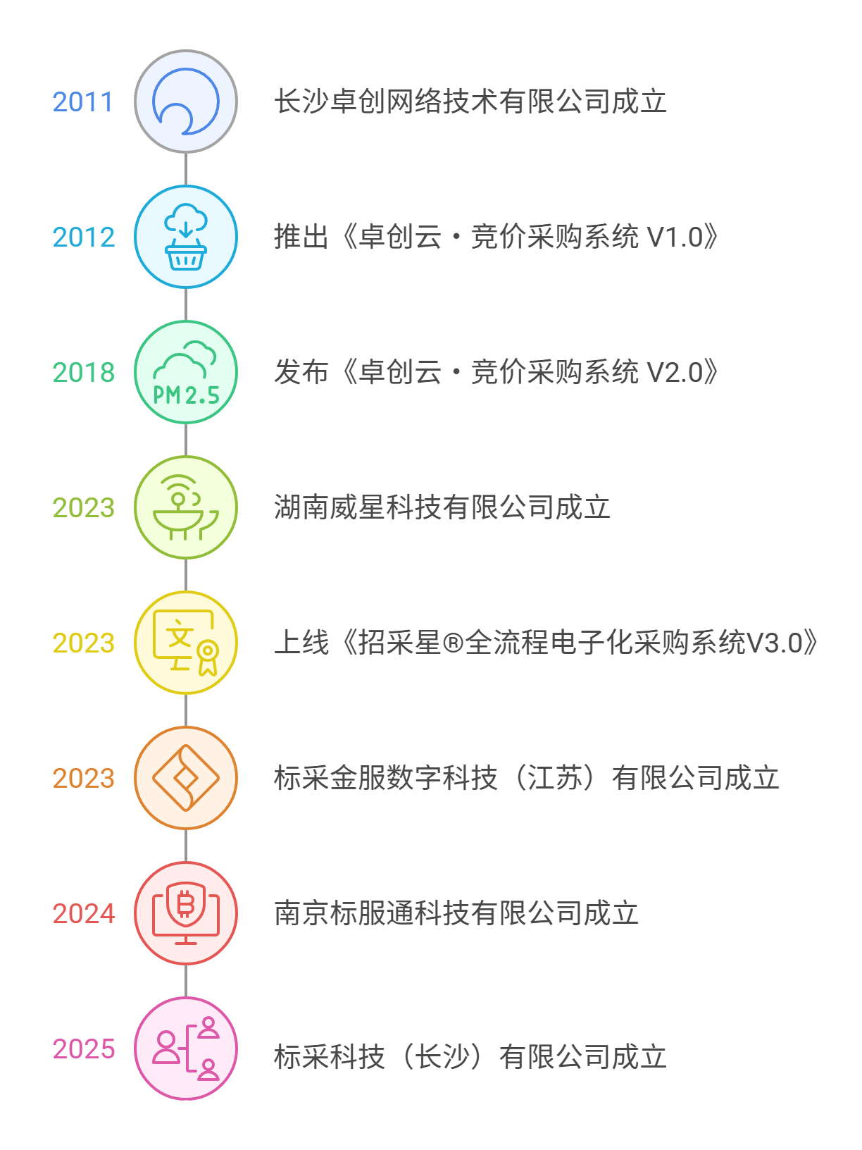 •长沙卓创网络技术有限公司成立(集团技术源头),率先布局 SaaS 模式招标采购系统研发,打破传统采购线下壁垒,奠定长沙研发中心的技术根基,首年服务超 100 家国企及政府机构。